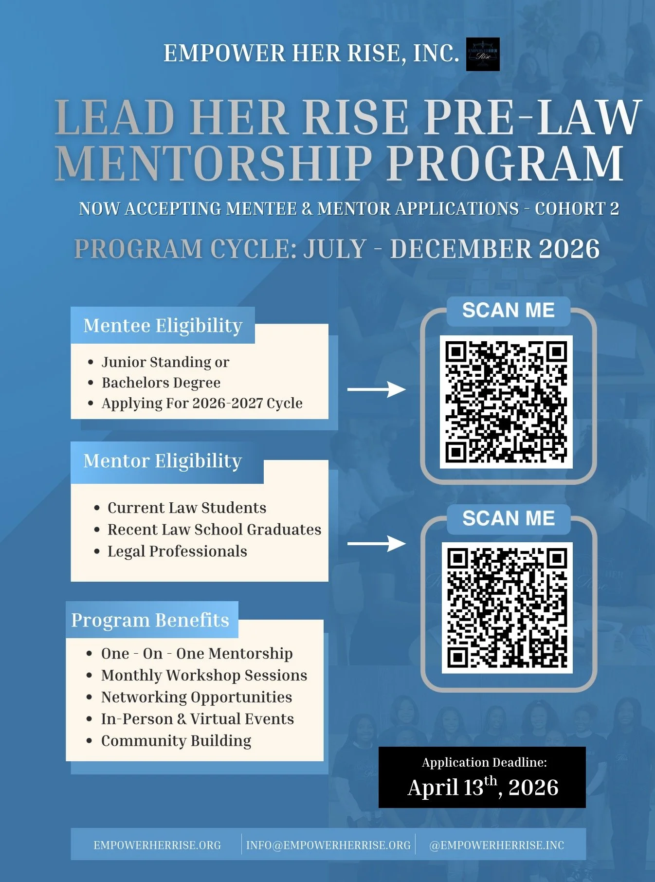 Our mission is to empower women of color from underserved and underrepresented communities through mentorship, leadership and professional development, and through community-centered programming that creates pathways to success in law, leadership, and higher education.